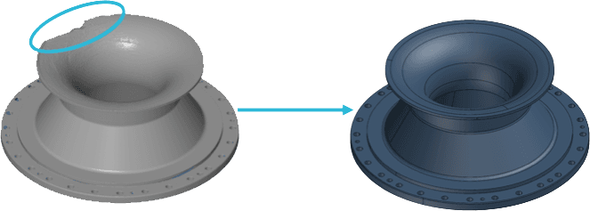 Ook beschadigde of onvolledige onderdelen kunnen reverse engineered worden. Scheuren, slijtage of ontbrekende stukken worden gereconstrueerd op basis van symmetrie, referenties of omliggende geometrie.